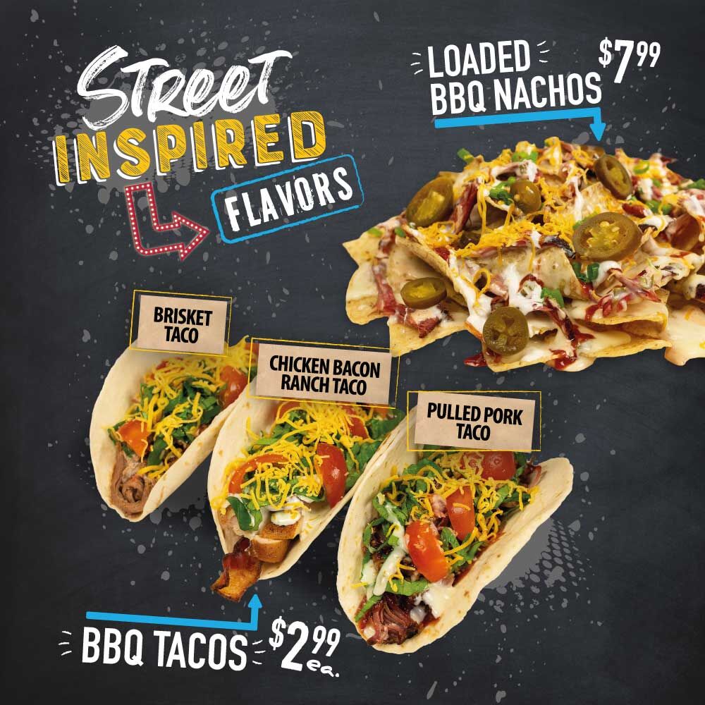 Freshly seasoned fries piled high with your choice of meat, creamy queso, shredded cheese drizzled with our house-made bbq ranch, mild sauce and green onions.